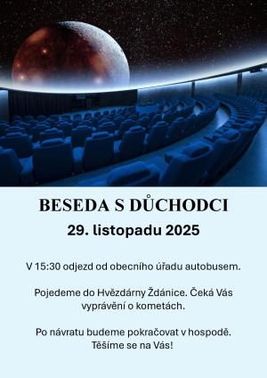 Zveme všechny seniory v sobotu 29. listopadu na výlet do hvězdárny do Ždánic. V 15:30 odjezd autobusem od obecního úřadu. Čeká Vás vyprávění o kometách. Po návratu budeme pokračovat v hospodě.