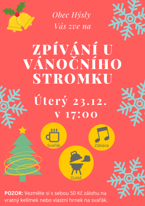 Obec Hýsly Vás srdečně zve na zpívání u vánočního stromku v pondělí 23. prosince v 17 hodin. Těšit se můžete na výborný gulášek a svařák. O sváteční atmosféru se postarají sbory Moravjanky, Paniháj a Šeprúnek. Podíváme se na nově přestehovanou knihovnu a vernisáž obrázků od dětí. Těšíme se na Vás!